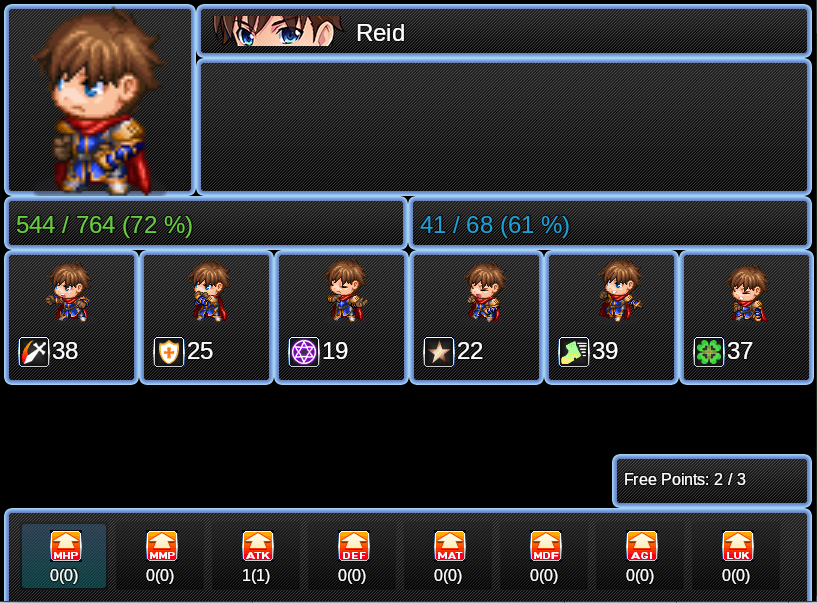 This is a level up stats plugin. It allows the game developer to add a scene which allows for stat allocation to actors on level up. You can set any number of stats per level up and you can set stat scaling per level.